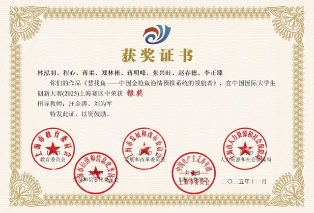 不仅在近期专项赛中屡获佳绩,“海鹰AI”项目在大创计划中也持续结出硕果。历经层层筛选与长时间的打磨,项目团队展现了极强的科研攻关能力与创新精神。从基础模型的构建到实船应用的落地,团队扎实的工作获得了评审专家的一致肯定,最终将上海市银奖与国家级铜奖收入囊中。