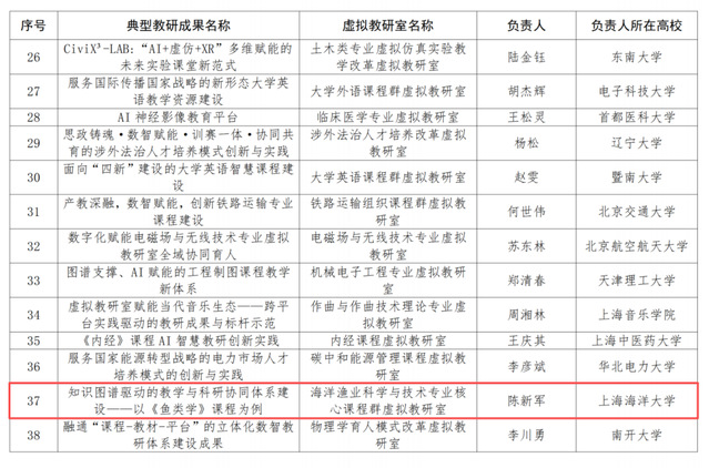 基于各虚拟教研室年报数据及申报材料,经学科协作组推荐和专家论证等工作程序,形成虚拟教研室试点建设典型名单,其中典型虚拟教研室50个、典型教研成果50项、典型教研方法100个。由上海海洋大学海洋生物资源与管理学院陈新军教授牵头组建的海洋渔业科学与技术专业核心课程群虚拟教研室聚焦虚拟教研室知识图谱体系建设,探索课程知识的智能化组织与教学创新路径,总结凝练“知识图谱驱动的教学与科研协同体系建设——以《鱼类学》课程为例”教研成果,并成功入选2025年度典型教研成果名单。此外,在2023和2024年度,海渔虚拟教研室曾先后入选了教育部虚拟教研室典型教研方法、教育部动物及林草水类虚拟协作组典型虚拟教研室。