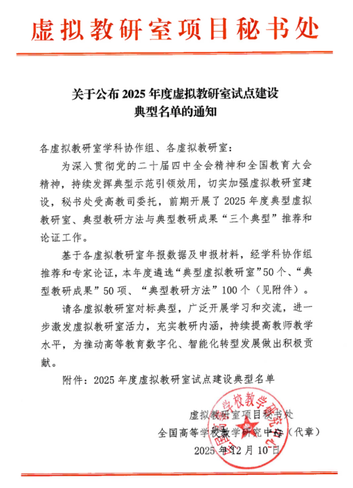 为深入贯彻党的二十届四中全会精神和全国教育大会精神,持续发挥典型示范引领效用,切实加强虚拟教研室建设,教育部虚拟教研室项目秘书处开展了典型虚拟教研室、典型教研方法、典型教研成果选树工作。